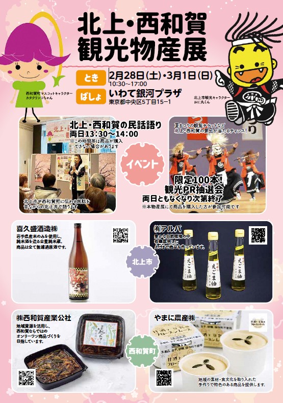 岩手県南部に隣接する北上市と西和賀町が、合同で物産展を行います。 それぞれのまちの物産事業者が皆様に直接商品をお届けするほか、地方ならではの魅力を伝える観光PRも行います。 また期間中は、北上・西和賀に伝わる民話の口演や、物産展でお買い物をしていただいた方限定の抽選会も開催! 2日間限定、北上市と西和賀町の魅力がたくさん詰まった物産展にぜひ遊びに来てください!